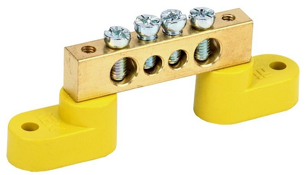 Шина PE "земля" на двух угловых изоляторах, сечение шины 8х12 мм, 4 контакта, In 125 А, 88х45х12 мм, материал латунь, t-раб. -40... +50°C, цвет изолятора желтый