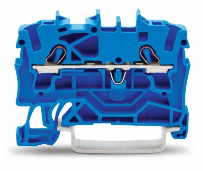 Клемма 2-х проводная проходная на DIN рейку, номинальный ток 32 А, номинальное напряжение 800 В, количество контактов 2 шт, размеры ВхДхШ 33х48,5х5,2 мм, сечение жилы 0,25 - 2,5 кв.мм, температура эксплуатации: -60…+105С, цвет синий