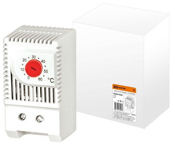 Термостат механический на DIN-рейку NC - для включения обогревателя. Задаваемая t-включения от 0 до 60°C, I-коммут. 10 А, U-номин. 230 В, IP20, габ. 60х33х43 мм