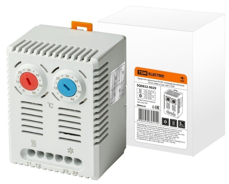 Термостат механический на DIN-рейку двухканальный: NO - для включения вентилятора, NC - для включения обогревателя. Задаваемая t-включения от 0 до 60°C, I-коммут. 10 А(обогрев)/5 А(охлажд.), U-номин. 230 В, IP20, габ. 67х50х46 мм