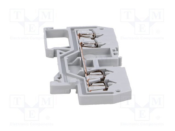 Клемма 4-проводная на DIN-рейку с боковым подключение, I-ном.18 А, U-ном.800 В, 4 контакта 1.5 кв.мм, t-раб.-60…+105°С, 6.3х4х2.7 мм, цвет серый