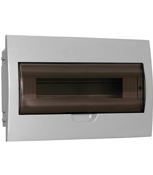 Щиток модульный с прозрачной дверцей для автоматических выключателей, встраиваемый, корпус АБС-пластик, дверца полистирол, типоразмер: 1 ряд, 18 модулей, шина N/PE 6х9 мм 8/1 - 1шт +шина N/PE 6х9 мм 10/1 - 1 шт, U-номин. 400В, I-номин. 63А, IP41, -20...+80 °С, 252х398х102 мм, цвет белый RAL 9016