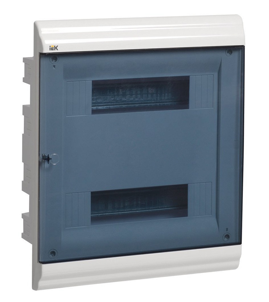 Щиток модульный с прозрачной дверцей для автоматических выключателей серия PRIME, встраиваемый, корпус АБС-пластик, дверца полистирол с замком-защелкой и нажимным механизмом, типоразмер: 1 ряд, 24 модуля, шина N/PE 6х9 мм 4/2 - 2 шт + шина N/PE 6х9 мм 10/2 - 2 шт, U-номин. 400В, I-номин. 100А, IP41, -25...+85 °С, 360х305х24 мм, цвет белый RAL 9016