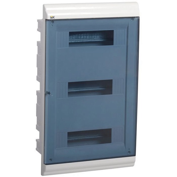Щиток модульный с прозрачной дверцей для автоматических выключателей серия PRIME, встраиваемый, корпус АБС-пластик, дверца полистирол с замком-защелкой и нажимным механизмом, типоразмер: 1 ряд, 36 модуля, шина N/PE 6х9 мм 8/2 - 1 шт + шина N/PE 6х9 мм 10/2 - 3 шт, U-номин. 400В, I-номин. 100А, IP41, -25...+85 °С, 360х305х24 мм, цвет белый RAL 9016