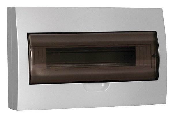 Щиток модульный с прозрачной дверцей для автоматических выключателей, настенный, корпус АБС-пластик, дверца полистирол, типоразмер: 1 ряд, 18 модулей, шина N/PE 6х9 мм 8/1 - 1 шт +шина N/PE 6х9 мм 10/1 - 1 шт, U-номин. 400В, I-номин. 63А, IP41, -20...+80 °С, 220х365х100 мм, цвет белый RAL 9016