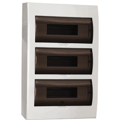 Щиток модульный с прозрачной дверцей для автоматических выключателей, настенный, корпус АБС-пластик, дверца полистирол, типоразмер: 3 ряда, 36 модуля, шина N/PE 6х9 мм 8/1 - 2шт +шина N/PE 6х9 мм 10/1 - 1 шт, U-номин. 400В, I-номин. 63А, IP41, -20...+80 °С, 473х307х105 мм, цвет белый RAL 9016