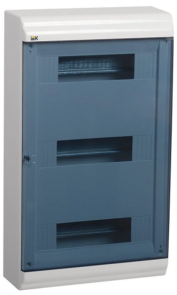 Щиток модульный с прозрачной дверцей для автоматических выключателей серия PRIME, настенный, корпус АБС-пластик, дверца полистирол с замком-защелкой и нажимным механизмом, типоразмер: 3 ряда, 36 модулей, шина N/PE 6х9 мм 8/2 - 2 шт + шина N/PE 6х9 мм 10/2 - 3 шт, U-номин. 400В, I-номин. 100А, IP41, -25...+85 °С, 490х290х100 мм, цвет белый RAL 9016