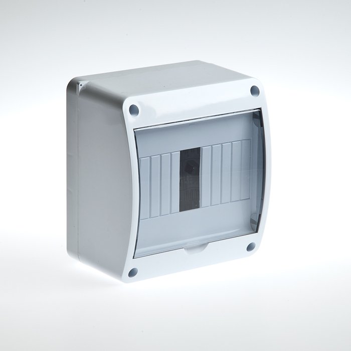 Щиток модульный для автоматических выключателей, с вертикальной дверцей , для открытой проводки, настенный, с прозрачной дверцей, имеет пластиковую дин-рейку, не имеет шину «земля-ноль», 125х140х85мм , IP41, белый