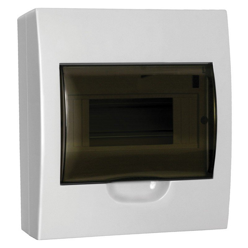 Щиток модульный с прозрачной дверцей для автоматических выключателей, настенный, корпус АБС-пластик, дверца полистирол, типоразмер: 1 ряд, 8 модулей, шина N/PE 6х9 мм 4/1 - 1 шт +шина N/PE 6х9 мм 8/1 - 1 шт, U-номин. 400В, I-номин. 63А, IP41, -20...+80 °С, 200х184х95 мм, цвет белый RAL 9016