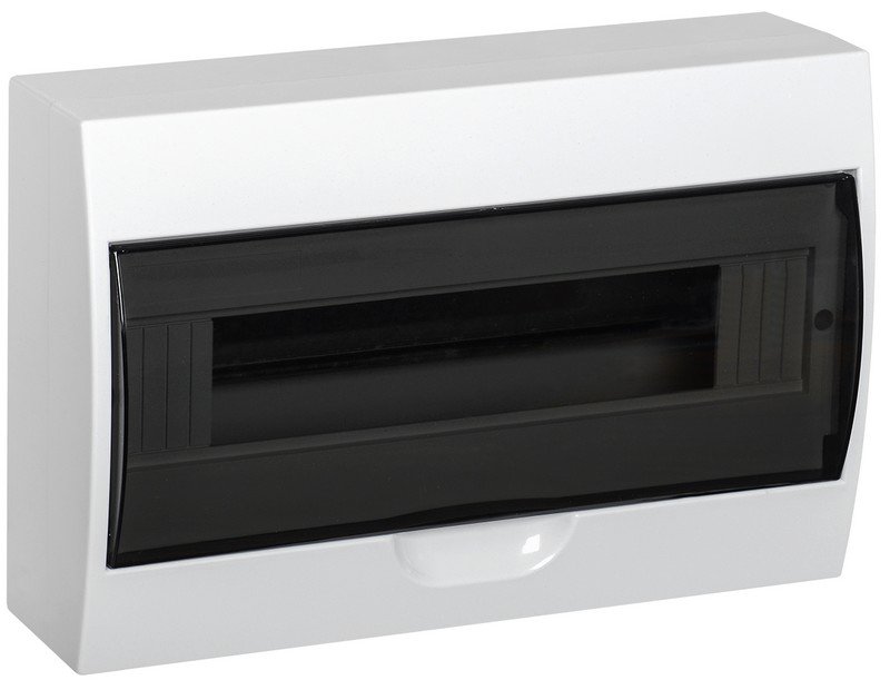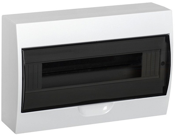 Щиток модульный настенный для открытой проводки с прозрачной дверцей на 15 модулей; в комплекте с металлической DIN-рейкой, заземляющими латунными шинами «земля-ноль», пластиковыми опорами под нулевую шину, крепежом; IP41, 310х200х90 мм, белый