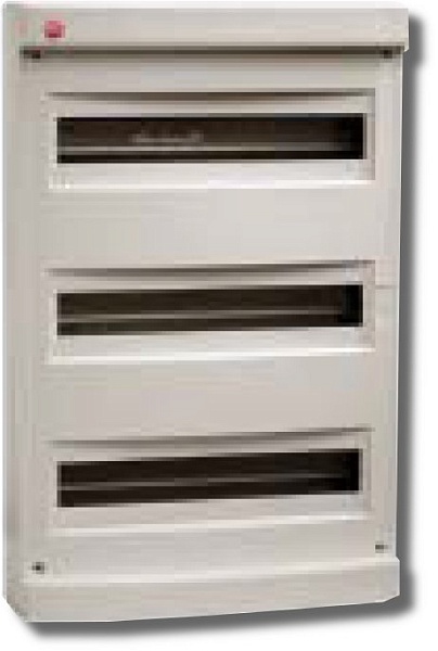 Щиток настенный с дверцей на 54 модуля (3 ряда х 18 модулей), материал термостойкий пластик, напряжение номинальное 400В, ударная прочность 6Дж, IP40, размеры (ВхШхГ) 627х410х138мм
