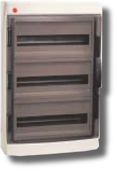 Щиток настенный с дверцей на 54 модуля (3 ряда х 18 модулей), материал термостойкий пластик, напряжение номинальное 400В, ударная прочность 6Дж, IP65, размеры (ВхШхГ) 657х426х148мм