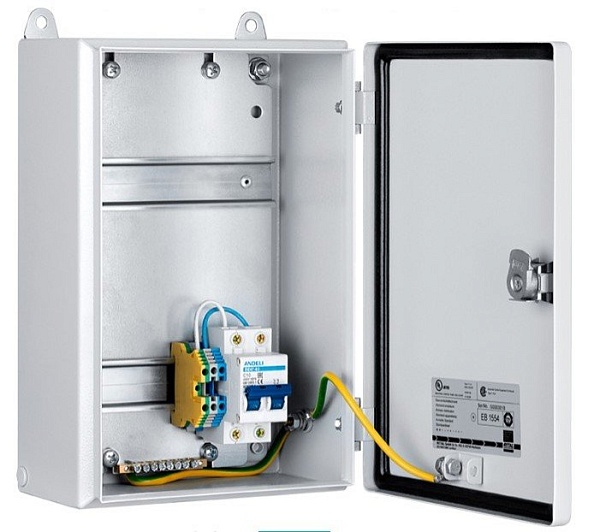 Шкаф монтажный без нагревателя. Комплектация: DIN-рейки; гермовводы; автомат 10A; клеммы проходные; вентилятор с термостатом., IP66, 200x300x210 мм.