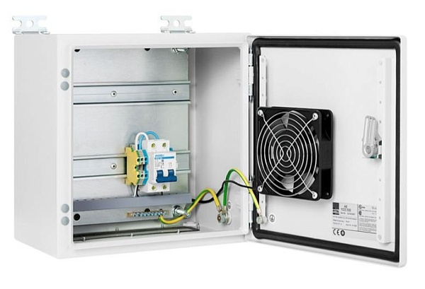 Шкаф монтажный всепогодный из листовой стали с порошковым покрытием, с монтажной панелью с DIN-рейками для клиентского оборудования, комплект [1] (с вентилятором); U-пит.100...240В; IP66, t-раб.-40...+60°С, 300x300x210 мм. В комплекте гермовводы, проходные клеммы, двухполюсный автомат (10 А), шина заземления, вентилятор с термостатом.