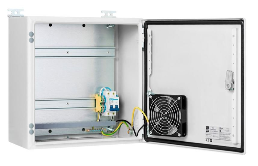 Шкаф монтажный всепогодный из листовой стали с порошковым покрытием, с монтажной панелью с DIN-рейками для клиентского оборудования, комплект [1] (с вентилятором); U-пит.100...240В; IP66, t-раб.-40...+60°С, 380x380x210 мм. В комплекте гермовводы, проходные клеммы, двухполюсный автомат (10 А), шина заземления, вентилятор с термостатом.