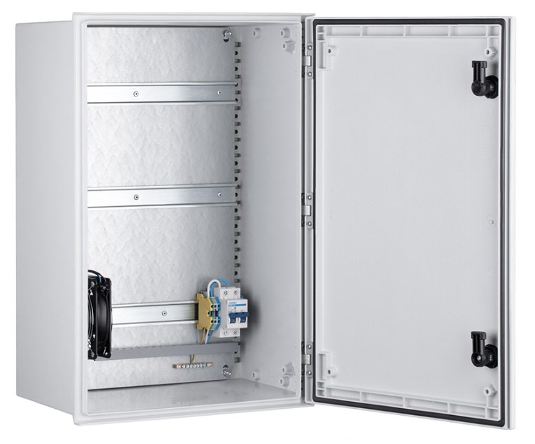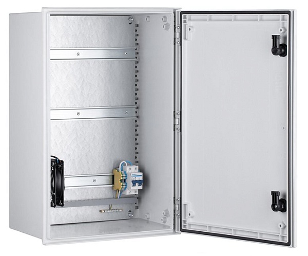 Шкаф монтажный всепогодный из армированного стекловолокном полиэстера, с монтажной панелью с DIN-рейками для клиентского оборудования, комплект [1] (с вентилятором); U-пит.100...240В; IP66, t-раб.-40...+60°С, 400x600x230 мм. В комплекте гермовводы, проходные клеммы, двухполюсный автомат (10 А), шина заземления, вентилятор с термостатом.