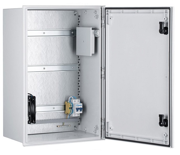 Шкаф монтажный всепогодный из армированного стекловолокном полиэстера, с монтажной панелью с DIN-рейками для клиентского оборудования, комплект [1,3] (с вентилятором и ODF); U-пит.100...240В; IP66, t-раб.-40...+60°С, 400x600x230 мм. В комплекте гермовводы, проходные клеммы, двухполюсный автомат (10 А), шина заземления, вентилятор с термостатом, оптический кросс на 4 FC адаптера.