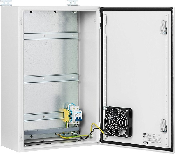 Монтажный шкаф, листовая нержавеющая сталь (AISI 304), DIN-рейка; гермовводы; автомат 10A; клеммы проходные; вентилятор с термостатом, оптический кросс, 380x600x210 мм.