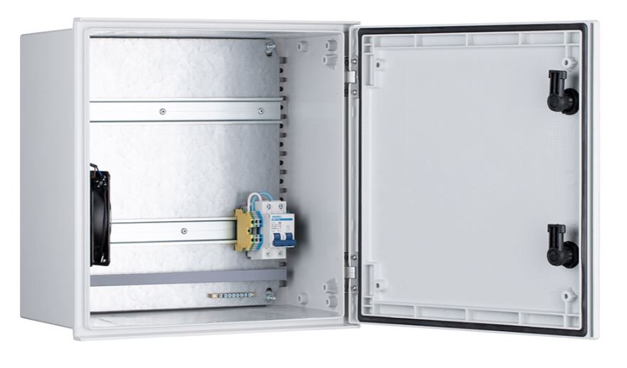 Шкаф монтажный всепогодный из армированного стекловолокном полиэстера, с монтажной панелью с DIN-рейками для клиентского оборудования, комплект [1] (с вентилятором); U-пит.100...240В; IP66, t-раб.-40...+60°С, 400x400x200 мм. В комплекте гермовводы, проходные клеммы, двухполюсный автомат (10 А), шина заземления, вентилятор с термостатом.
