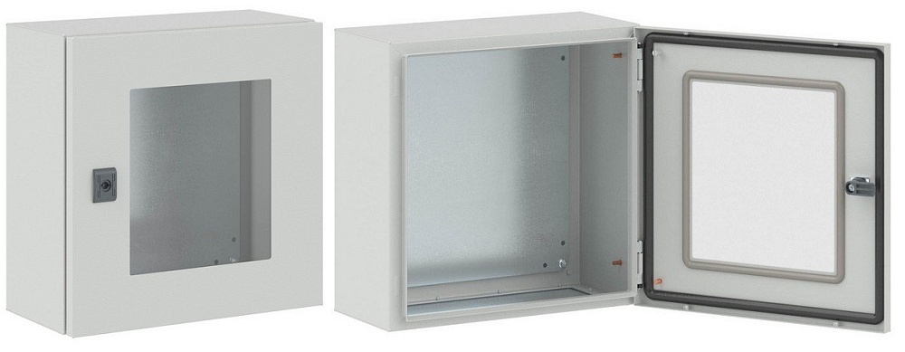 Навесной шкаф с прозрачной дверью серии CE, IP66, 400х400х200 мм (ВхШхГ). В комплекте с монтажной платой, дверью, замком без ручки, фланцем для ввода кабеля, монтажными аксессуарами