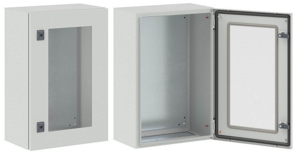 Навесной шкаф с прозрачной дверью серии CE, IP65, 600х400х250 мм (ВхШхГ). В комплекте с монтажной платой, дверью, замком без ручки - 2 шт, фланцем для ввода кабеля, монтажными аксессуарами