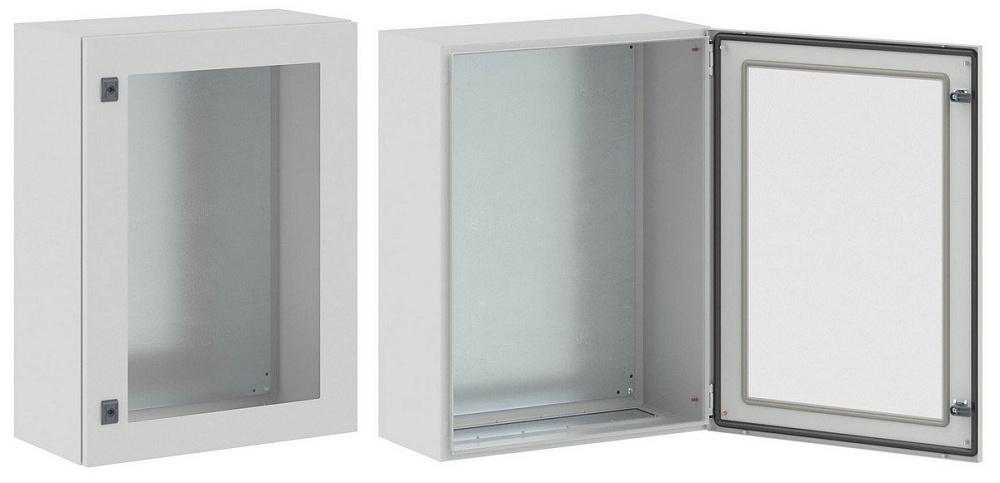 Навесной шкаф с прозрачной дверью серии CE, IP65, 800х600х300 мм (ВхШхГ). В комплекте с монтажной платой, дверью, замком без ручки - 2 шт, фланцем для ввода кабеля, монтажными аксессуарами