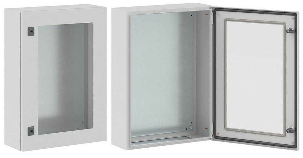 Навесной шкаф с прозрачной дверью серии CE, IP65, 700х500х250 мм (ВхШхГ). В комплекте с монтажной платой, дверью, замком без ручки - 2 шт, фланцем для ввода кабеля, монтажными аксессуарами