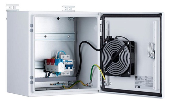 Шкаф монтажный всепогодный из листовой стали с порошковым покрытием, с монтажной панелью с DIN-рейками для клиентского оборудования, комплект [1,2] (с вентилятором и нагревателем); U-пит.100...240В, P-потр.100 Вт; IP66, t-раб.-40...+60°С, 300x300x210 мм. В комплекте гермовводы, проходные клеммы, двухполюсный автомат (10 А), шина заземления, вентилятор с термостатом, нагреватель с термостатом.