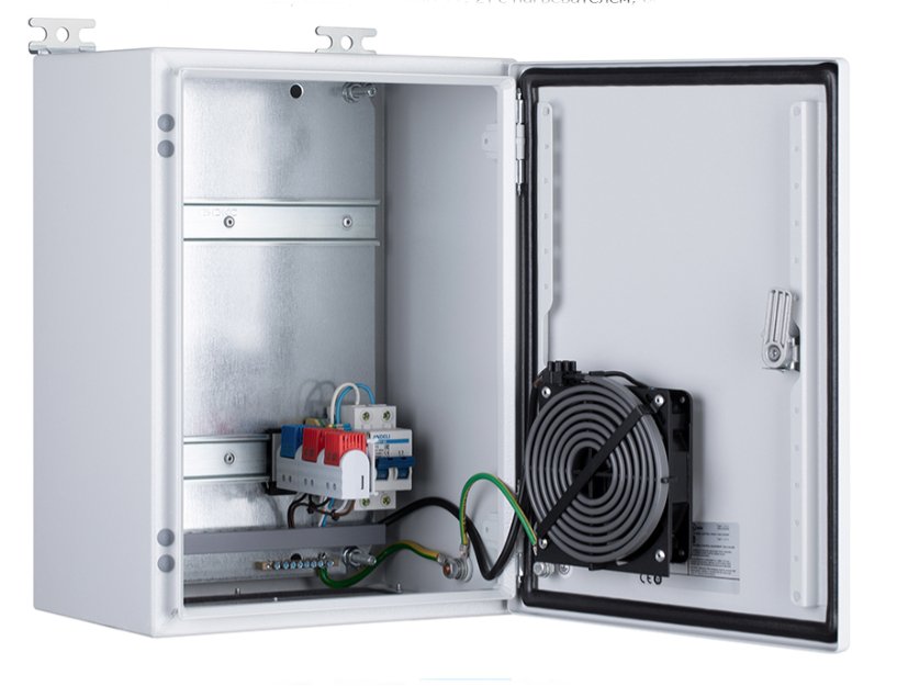 Шкаф монтажный всепогодный из листовой стали с порошковым покрытием, с монтажной панелью с DIN-рейками для клиентского оборудования, комплект [1,2] (с вентилятором и нагревателем); U-пит.100...240В, P-потр.100 Вт; IP66, t-раб.-40...+60°С, 300x400x210 мм. В комплекте гермовводы, проходные клеммы, двухполюсный автомат (10 А), шина заземления, вентилятор с термостатом, нагреватель с термостатом.