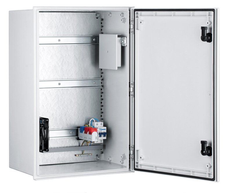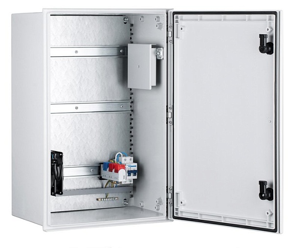 Шкаф монтажный всепогодный из армированного стекловолокном полиэстера, с монтажной панелью с DIN-рейками для клиентского оборудования, комплект [1,2,3] (с вентилятором, нагревателем и ODF); U-пит.100...240В, P-потр.100 Вт; IP66, t-раб.-40...+60°С, 400x600x230 мм. В комплекте гермовводы, проходные клеммы, двухполюсный автомат (10 А), шина заземления, вентилятор с термостатом, нагреватель с термостатом, оптический кросс на 4 FC адаптера.