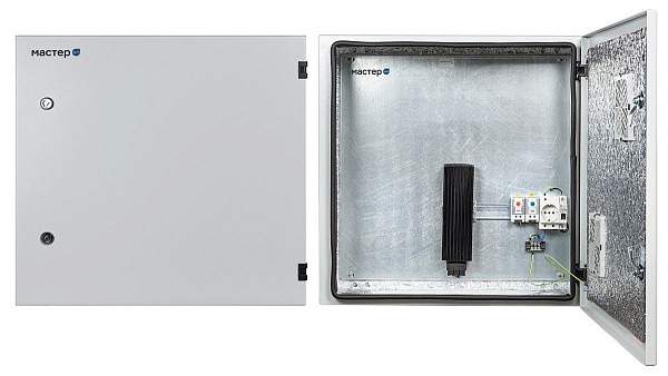 Шкаф климатической защиты с монтажной платой, подогревом и предстартом; U-пит.220 В, P-нагрев..150 Вт; IP66, t-раб.-50...+50°С, 600х600х210 мм. В комплекте: замок, ключ, гермовводы, розетка, термореле, нагреватель.
