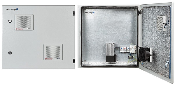 Шкаф монтажный уличный с активной вентиляцией; U-пит.220 В, I-ном.10 А, P-потр.300 Вт, P-обогрев.250 Вт, P-вент.21 Вт; IP54, t-раб.-35…+50°С, 600х600х210 мм