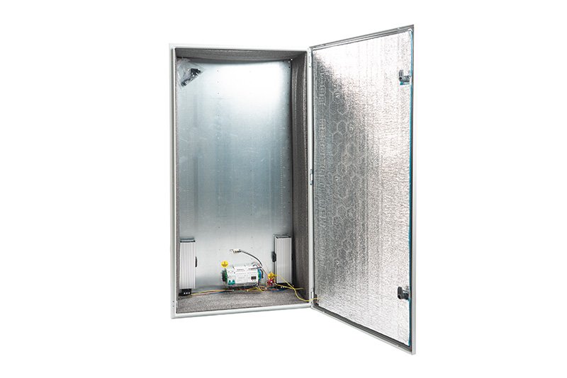 Шкаф металлический уличный утепленный с автоматикой управления климатом; U-пит.170...250В, I-нагр.5 А, два нагревателя по 150 В; выход "АВАРИЯ"; IP65, t-раб.-65...+50С, 1200х600х300 мм, 39 кг.