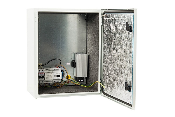 Шкаф металлический уличный утепленный с автоматикой управления климатом; U-пит.170...250В, I-нагр.5 А, P-нагрев.60 В; выход "АВАРИЯ"; IP65, t-раб.-45...+50С, 400х510х260 мм, 13.3 кг.