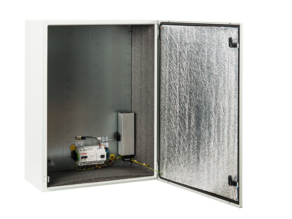 Шкаф металлический уличный утепленный с автоматикой управления климатом; U-пит.170...250В, I-нагр.5 А, P-нагрев.150 В; выход "АВАРИЯ"; IP65, t-раб.-65...+50С, 800х600х300 мм, 27 кг.
