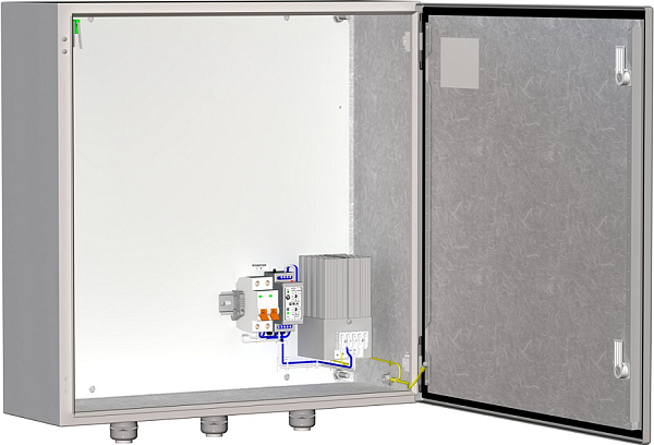Шкаф монтажный с обогревом обеспечивает эксплуатацию аппаратуры при температуре окружающей среды -60…+50°С. Независимое включение подогрева и линии питания. Интервал удержания рабочей температуры ±2°С, 600х600х210 мм
