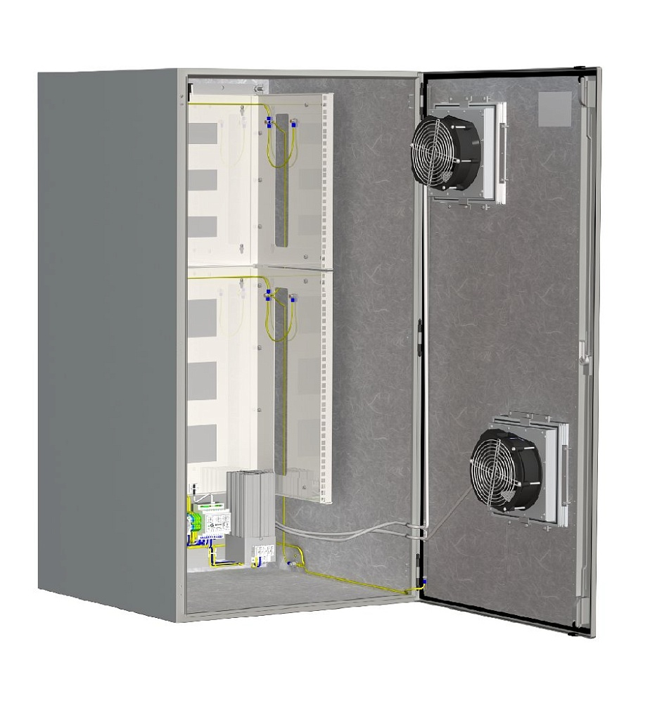 Термошкаф с вентилятором; AC 220 В; I-нагр.6 А(max); P-потр.636 Вт (обогрев); P-потр.36 Вт (вентилятор); IP55; -50...+50°С; 600х1200х600 мм. В комплекте: блок управления климатом (БУК-3В), обогреватель шкафов ОТШ-300, два вентилятора, тампер. Для установки 19" оборудования.