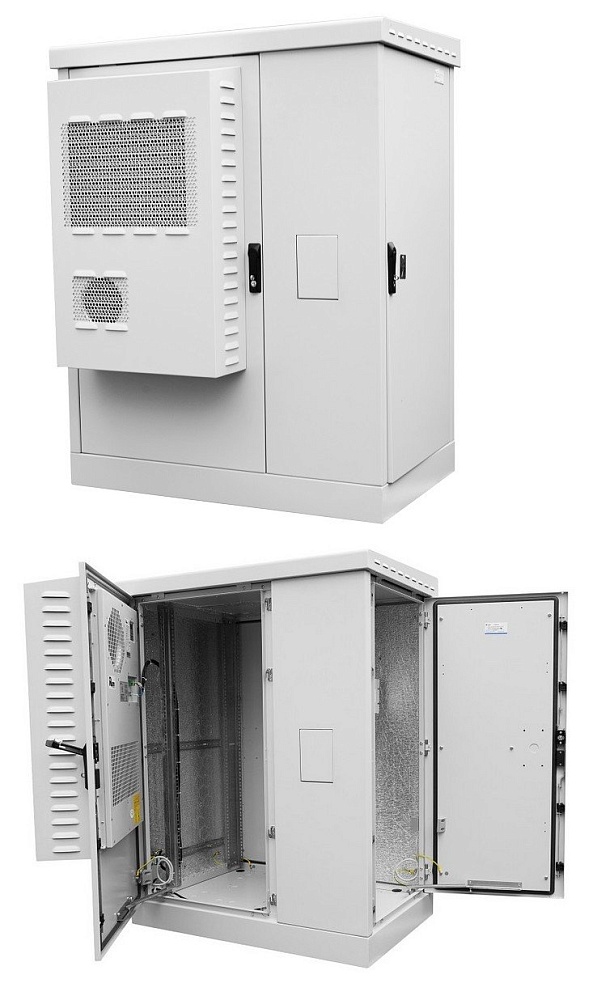 Всепогодный шкаф 19" напольный с кондиционером(охлаждение+нагрев), 18U, 1040x1045x630 мм; полезная глубина 520 мм, материал сталь 2мм, 3 двери, цвет серый, неразборный, допустимая нагрузка до 800 кг, вес 199 кг, IP54, -50…+45°C.