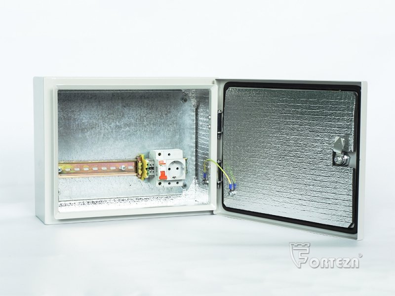 Металлический шкаф с термоизоляцией, IP66, t-раб.-60…+50°С, 380х300х150 мм. В комплекте: монтажная панель (340х280 мм), замок на дверце, автомат 10А, розетка, клеммные колодки.