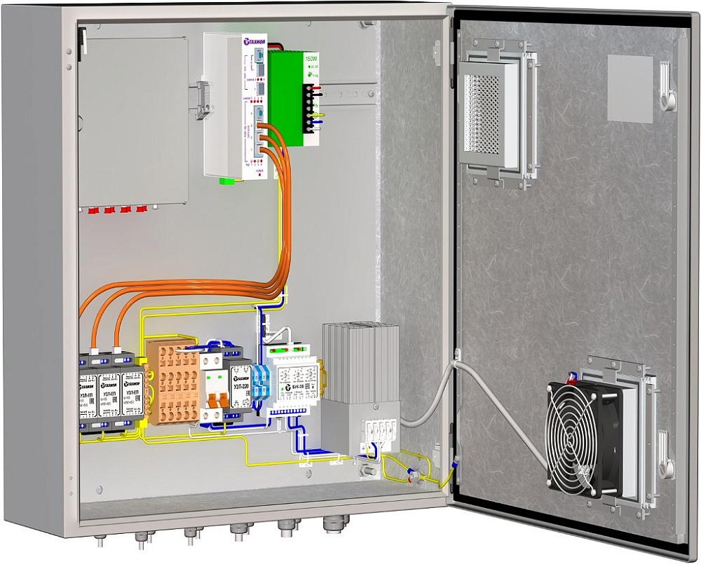 Термошкаф с вентилятором; AC 220 В; I-нагр.6 А(max); P-потр.178 Вт (обогрев); P-потр.18 Вт (вентилятор); IP55; -50...+50°С; 600х600х210 мм. В комплекте: блок управления климатом (БУК-3В), обогреватель шкафов ОТШ-160, вентилятор, тампер.