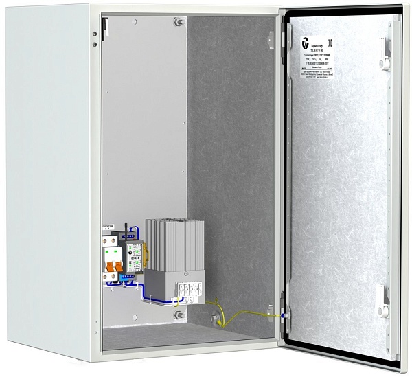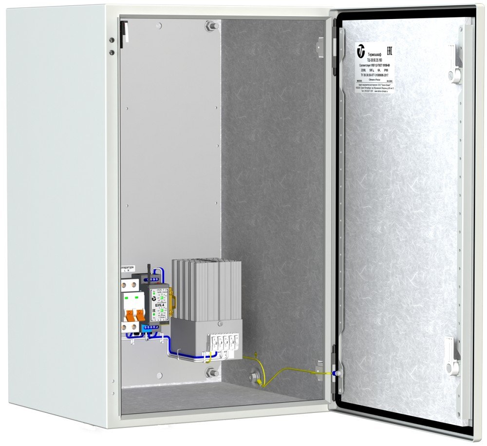 Термошкаф оборудован: блоком управления климатом (БУК-4), предназначенным для управления холодным запуском аппаратуры, обогревателем термошкафов ОТШ-200, оборудованным встроенным биметаллическим выключателем, тамперным контактом для сигнализации о несанкционированном доступе, диапазон рабочих температур -60° до +50°С, IP66. Потребляемая мощность 178 Вт. Напряжение питания 220В ±15% AC, 6A. 380х600х350 мм.