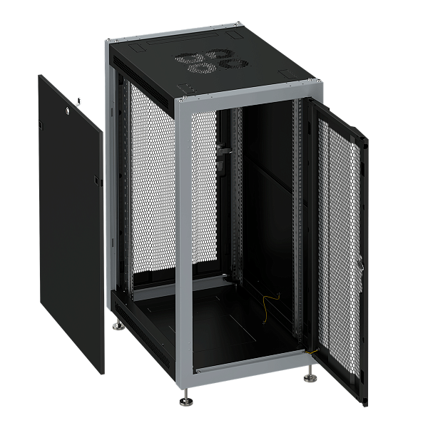 Шкаф телекоммуникационный 19", напольный, 22U, 600x600x1100мм (ШхГхВ), передняя дверь перфорированная, задняя дверь перфорированная, поворотная ручка с замком, цвет черный (RAL 9004/RAL 7000)