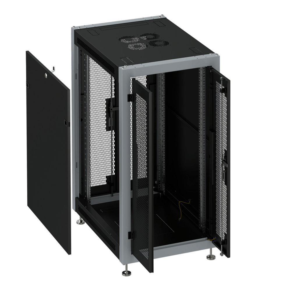 Шкаф монтажный телекоммуникационный 19", напольный, 22U, 600x600x1100mm (ШхГхВ), передняя дверь двухстворчатая перфорированная, задняя дверь двухстворчатая перфорированная, поворотная ручка с замком, цвет черный (RAL 9004/RAL 7000). Разобранный.