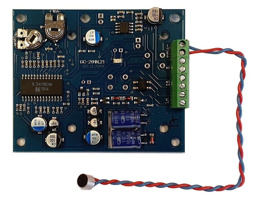 Абонентский комплект громкой связи GC-2001N2 без корпуса, без громкоговорителя, работает с пультами GC-1001D4, GC-1006D, GC-1009D, GC-3006DG, серии GC-1036F. Абонентский комплект громкой связи GC-2001N2 обеспечивает: - режим громкой дуплексной связи; - автоматическое включение / выключение с диспетчерского пульта; - ручное включение с помощью кнопки. Питание осуществляется от диспетчерского пульта.