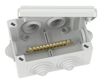 Коробка уравнивания потенциалов, кол-во вводов: 6 шт Ø 25 мм, кол-во зажимов: 10 шт, не содержит галогенов, тип ввода в корпус: уплотнительная мембрана, IP55, t-раб.: -25...60 °C, размер: 120х80х50 мм, пластик, цвет серый
