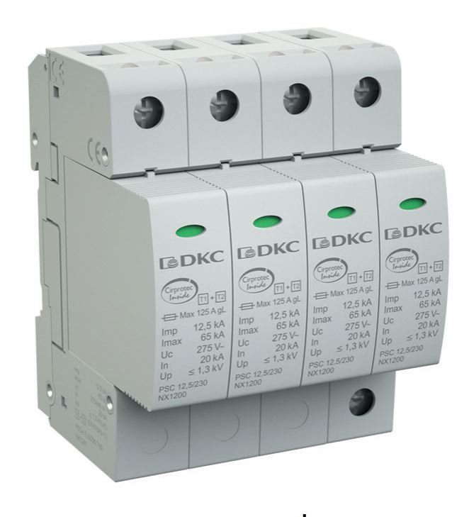 УЗИП, класс I+II, 4-полюсный, L1-L2-L3-N, 12,5кA, на основе газонаполненных разрядников и оксидно-цинковых варисторов рекомендуется к применению в любых зданиях и сооружениях, подверженных ударам молнии. Устанавливаются на уровне главного распределительного щита. Монтаж на DIN-рейку.