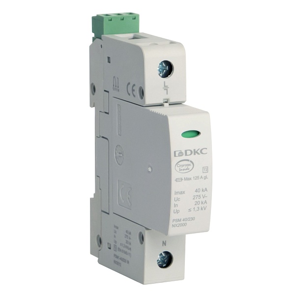 УЗИП, класс II, 1-полюсный, L-N, 40кА, выход "СК" - удаленный контроль, на основе оксидно-цинковых варисторов рекомендуется для защиты сетей низкого напряжения от импульсов перенапряжения, возникающих при коротких замыканиях, коммутации энергоемкого оборудования или удаленном ударе молнии в питающую сеть. Устанавливаются на уровне распределительного щита. Монтаж на DIN-рейку.