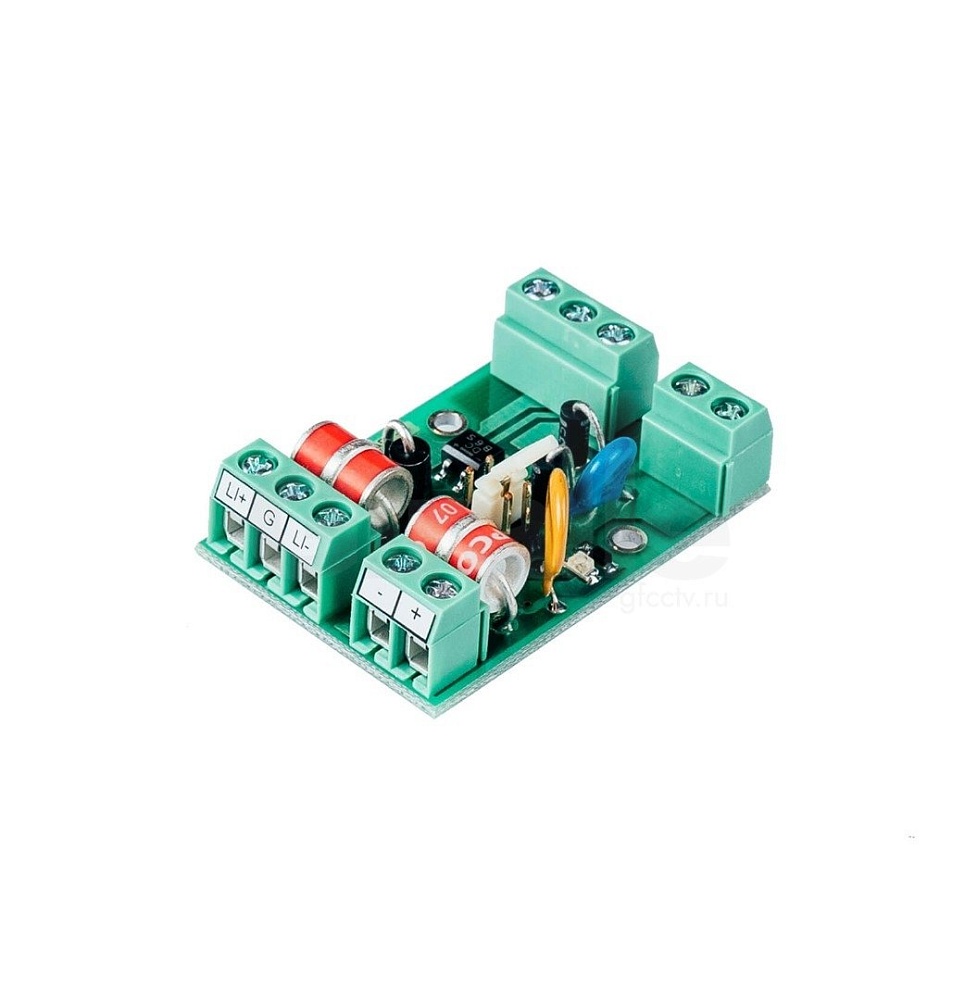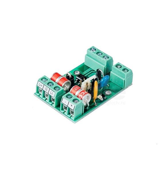 Устройство для защиты протяженных несимметричных и симметричных линий передачи аналогового и цифрового сигнала и линии питания от наведенных напряжений, вызванных эл./магн. импульсами высоких энергий (грозовой разряд и т.п.). Линия питания имеет защиту от короткого замыкания и превышения пит. напряжения, макс. ток в цепи питания: 1А, напряжение ограничения: канала передачи видео/данные - 7.3В, питание - 12/24В (витая пара/коаксиальный кабель). Импульсный разрядный ток 8/10 мк/с - 10кА, потери в цепи передачи - 1дБ, -40...+50°С, 80х38х21 мм.