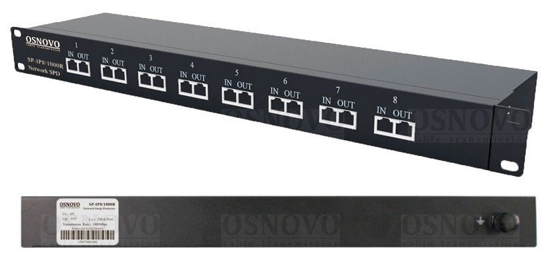 Устройство грозозащиты для Ethernet сети 1000 Мбит/с; 8 портов(конт. 1/2,3/6,4/5,7/8). Двухступенчатая защита. Максимальное длительное рабочее напряжение (Uc) 6В. Номинальный ток разряда (8/20 мкс, In) 2,5kA. Максимальный ток разряда (8/20 мкс, Itotal) 20kA. Время отклика не более 10нc; Монтаж в 19" стойку (1U); 487x44,5x102мм. -40…+80°С.