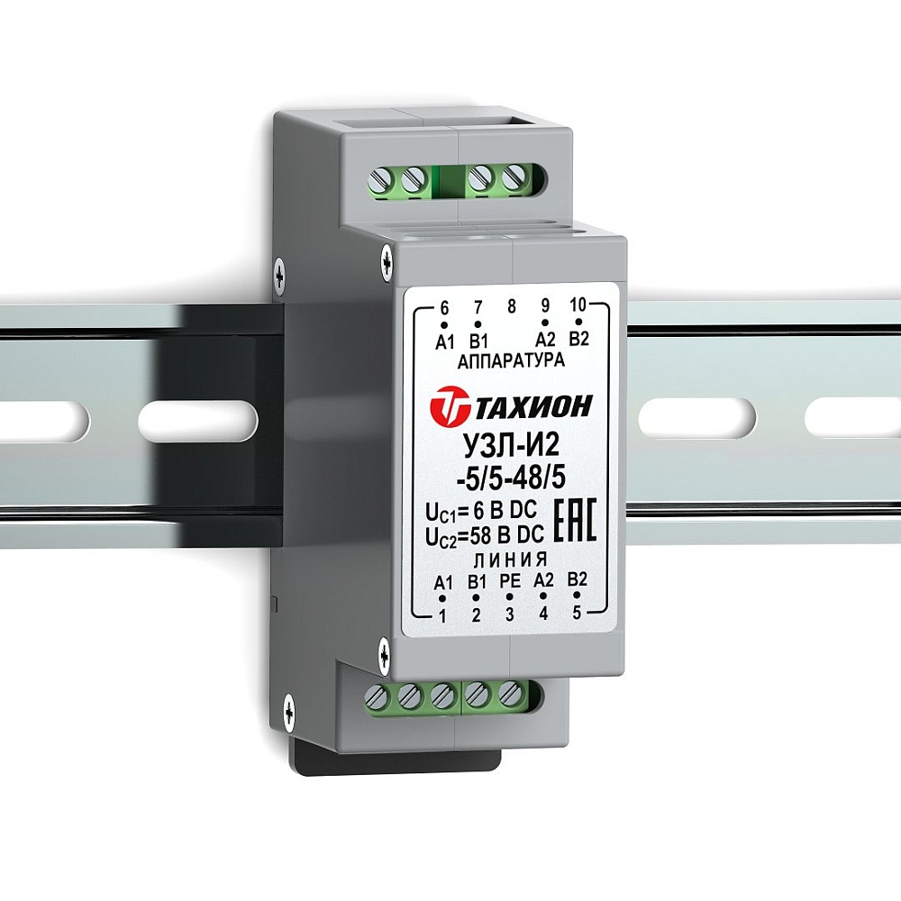 Двухканальное устройство защиты оборудования, использующего 2х проводные линии интерфейса с подачей питания. Обеспечивает защиту интерфейса и передачу питания 5 В DC по первому каналу и 48 В DC по каналу второму каналу по сигнальным парам с величиной тока до 5 А. Крепление на DIN-рейку. - 55°С - +85°С, 89х58х35 мм.